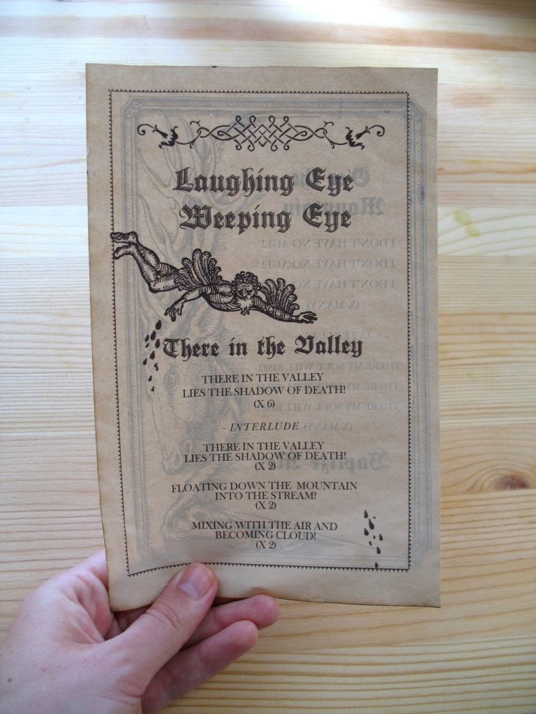 In the early days of Laughing Eye Weeping Eye music (2010-2012), I created songbooks for audience members. Songbooks were aged to look old, and audience voices’ raised ecstatic energy.