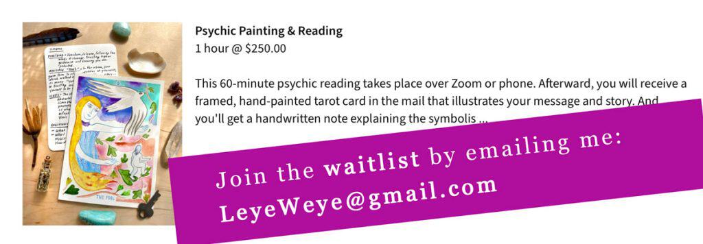 Meetups can take place in person, via phone, IM chat, or via a digital platform. All of the information and policies outlined under the previous “My Practice,” and “Description of a reading/session” apply to meetups and events.