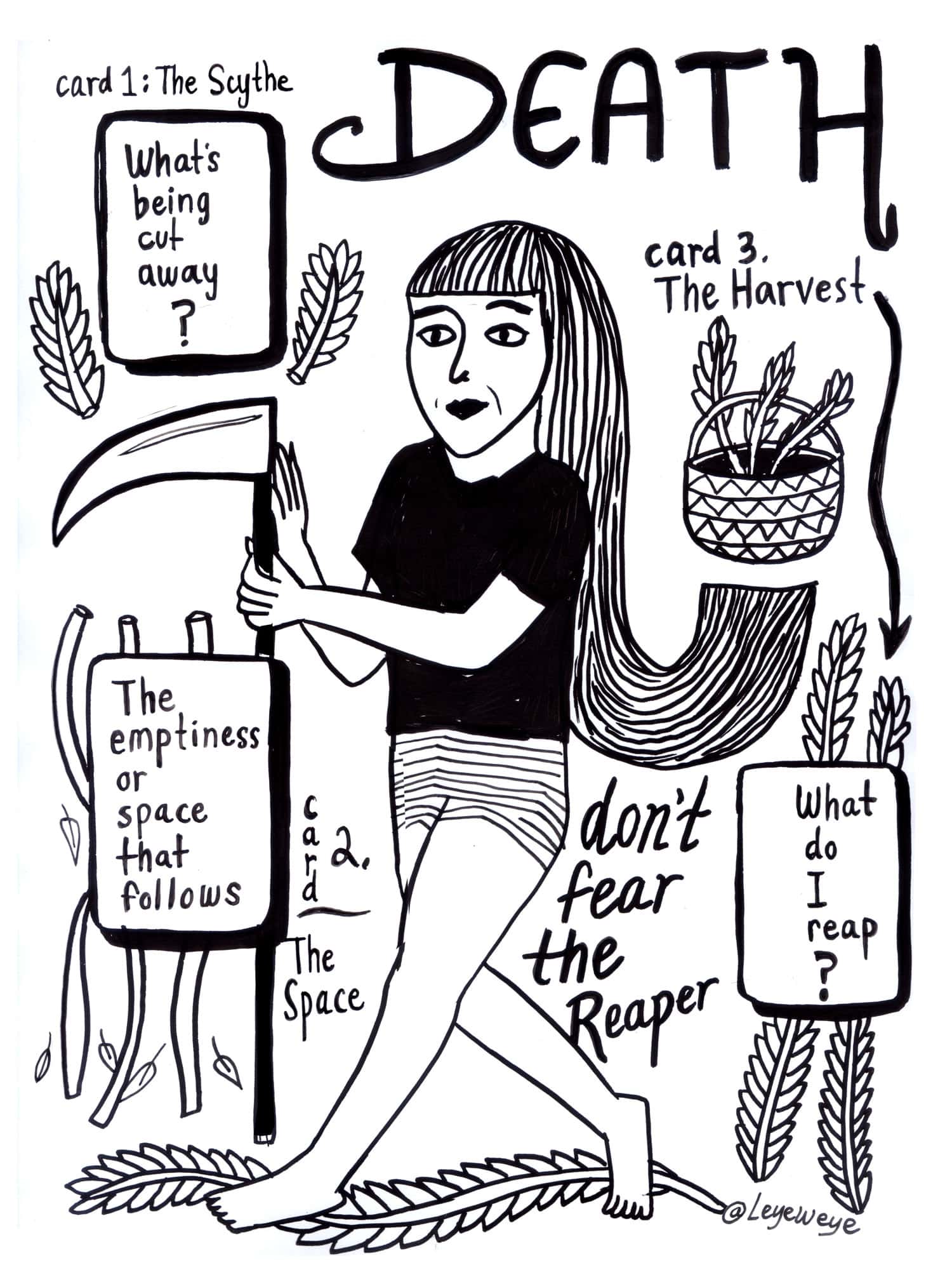 I sometimes read Death as a “no” answer to a question. For example, it may suggest walking away from a relationship, job, or something else that you want, but that ultimately doesn’t jive with your spirit.
