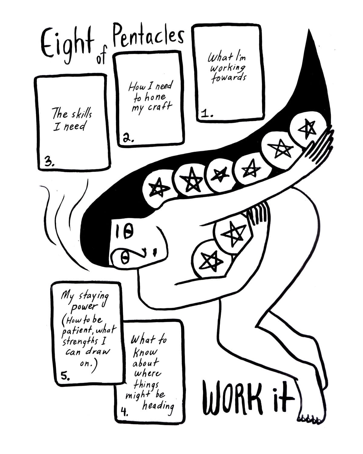 If you are drawn to the Eight of Pentacles and want to dig deeper, get them outta your deck, make them your mascot, and draw some cards from the rest of the deck with this tarot spread I created!