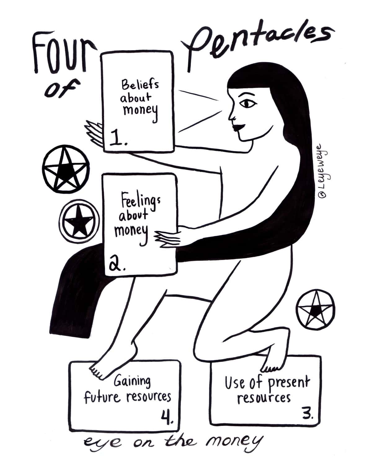 If you are drawn to the financial aspect of the Four of Pentacles and want to dig deeper, get them out of your deck, make them your mascot, and draw some cards from the rest of the deck with this tarot spread I created!