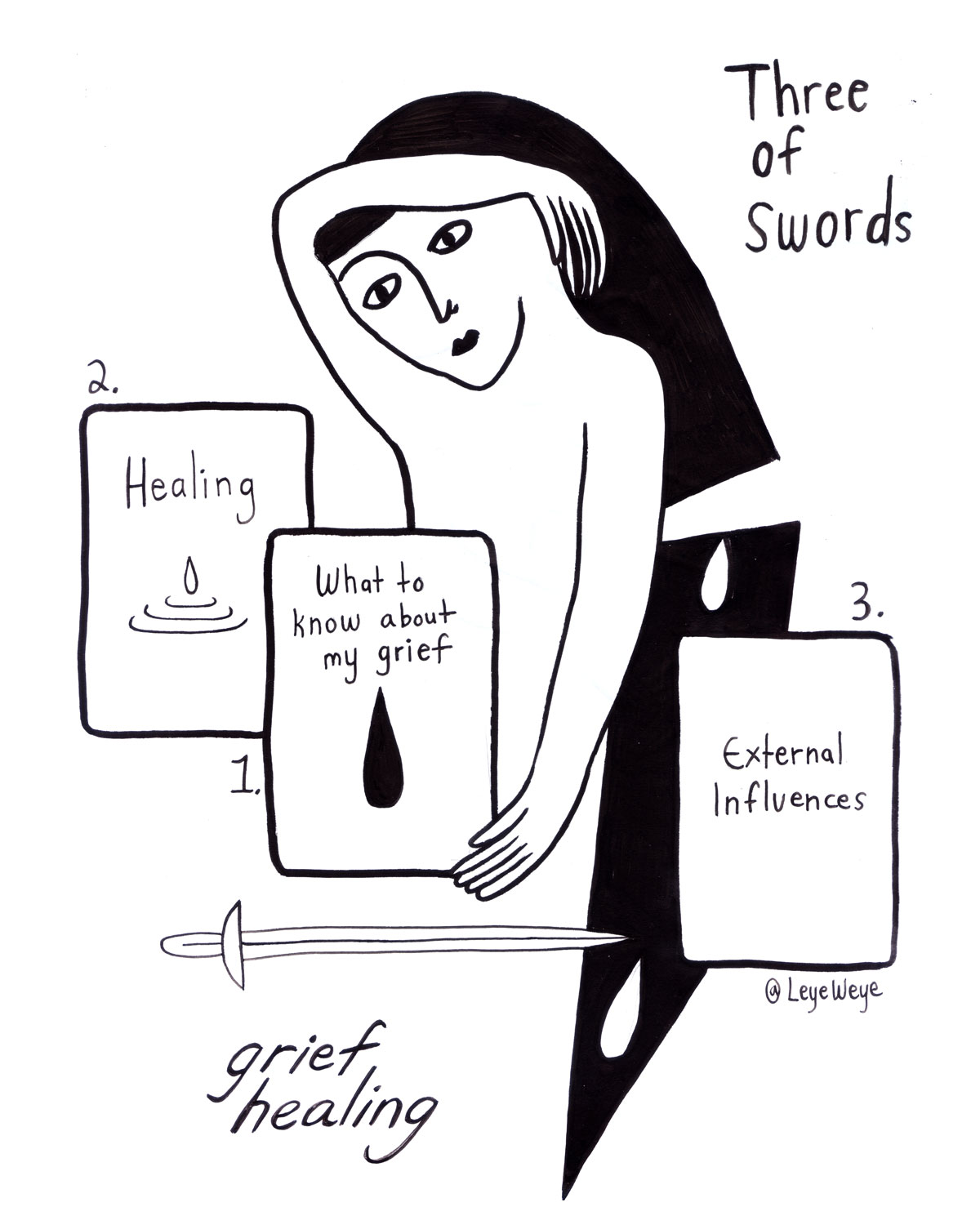 Do you want to do some grief healing? Here’s a spread I created for the Three of Swords. If you don’t read the cards, consider using the cards as journaling prompts.