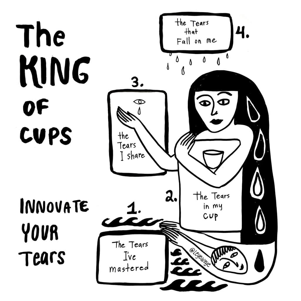 Sitting afloat a world of waves, the King knows what lies beneath. Water and cups symbolize the psyche; the place of our most vulnerable experiences and longings. Going inward to explore their trauma, fear, and desires, the King of Cups represents the ability to listen to our deepest self and shape our lives around what we hear.