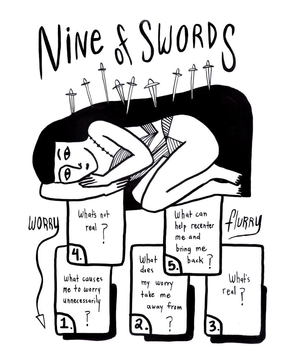 If you are drawn to the Nine of Swords and want to dig deeper, get them outta your deck, make them your mascot, and draw some cards from the rest of the deck with this tarot spread I created!