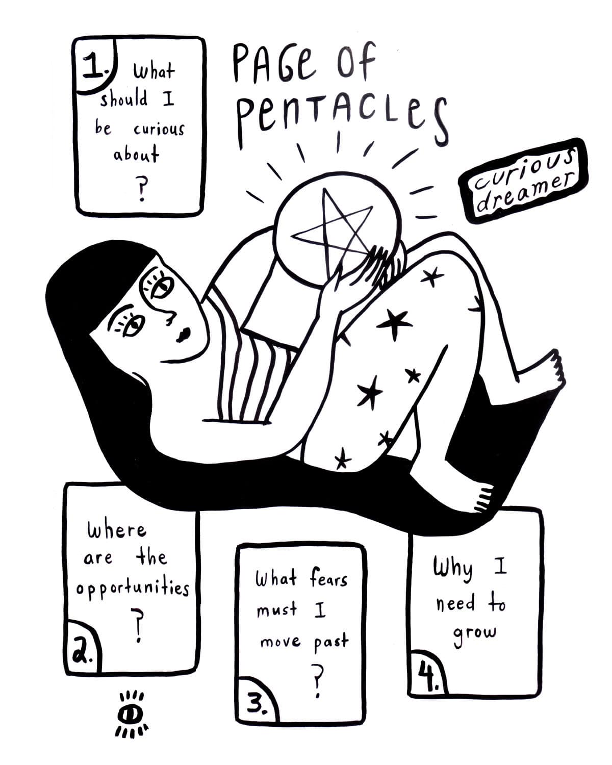 If you are drawn to the Page of Pentacles and want to dig deeper, get them outta your deck, make them your mascot, and draw some cards from the rest of the deck with this tarot spread I created!