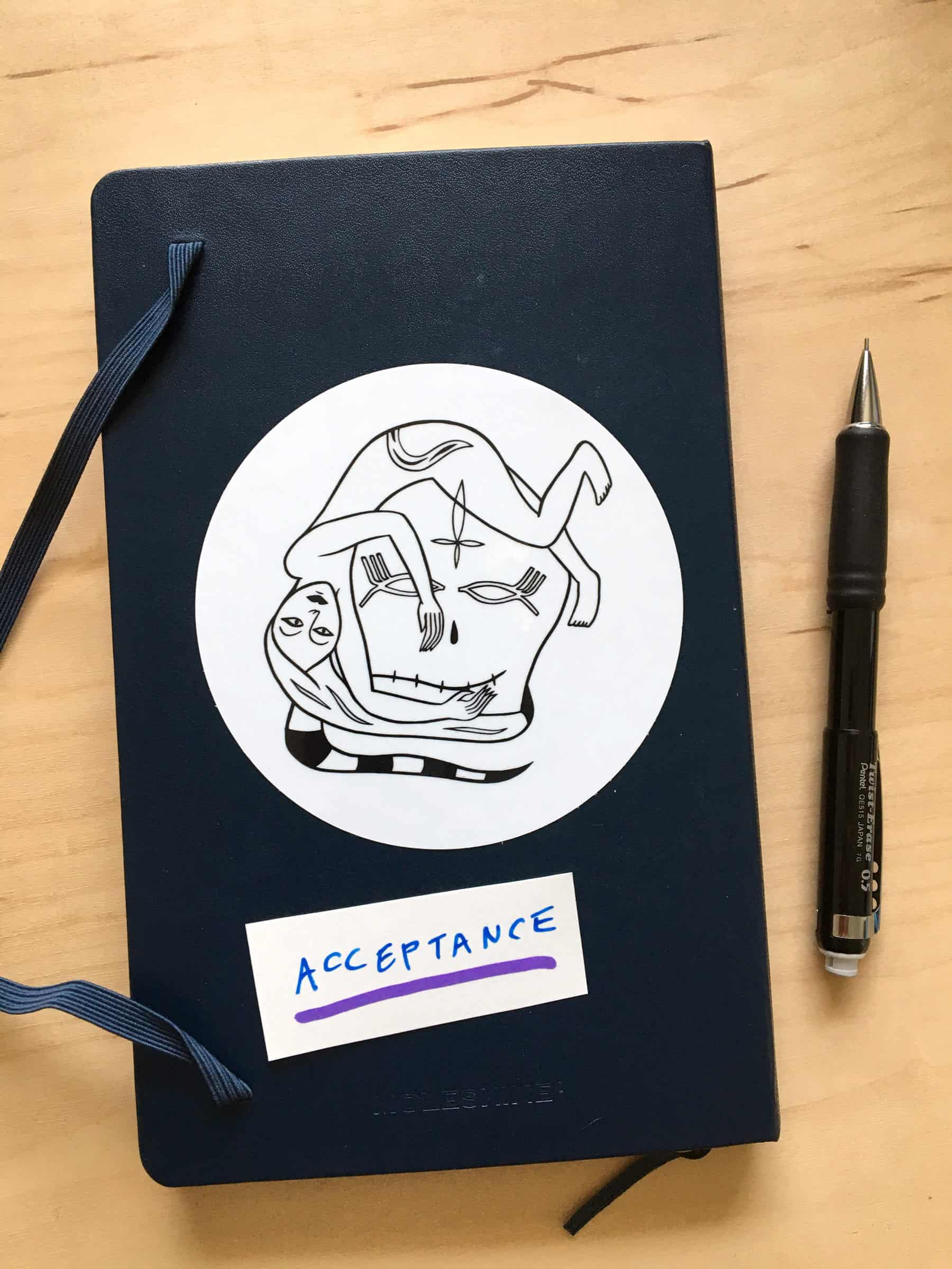Acceptance sticker – for all ya need to be at peace with. Sized 4″ 4″. Great for sketchbook covers, helmets, skateboards, water bottles; whatever you freakin’ want!