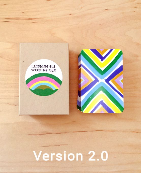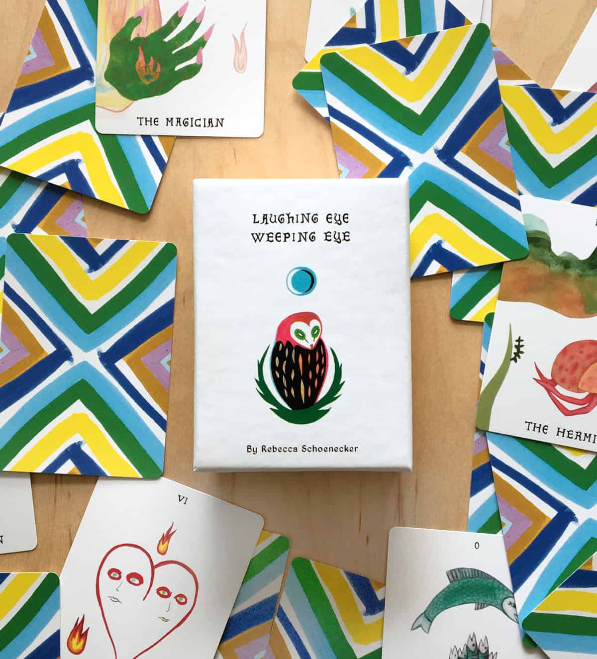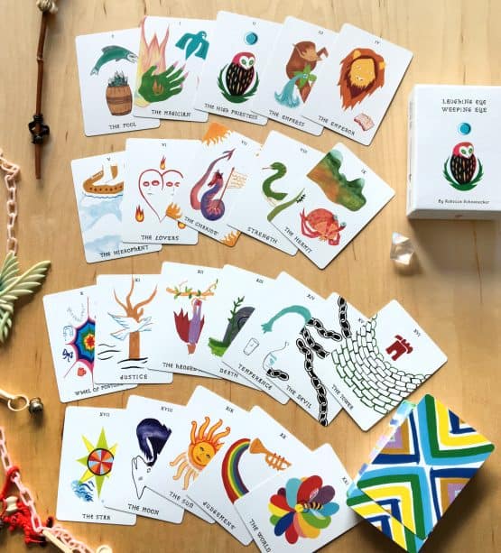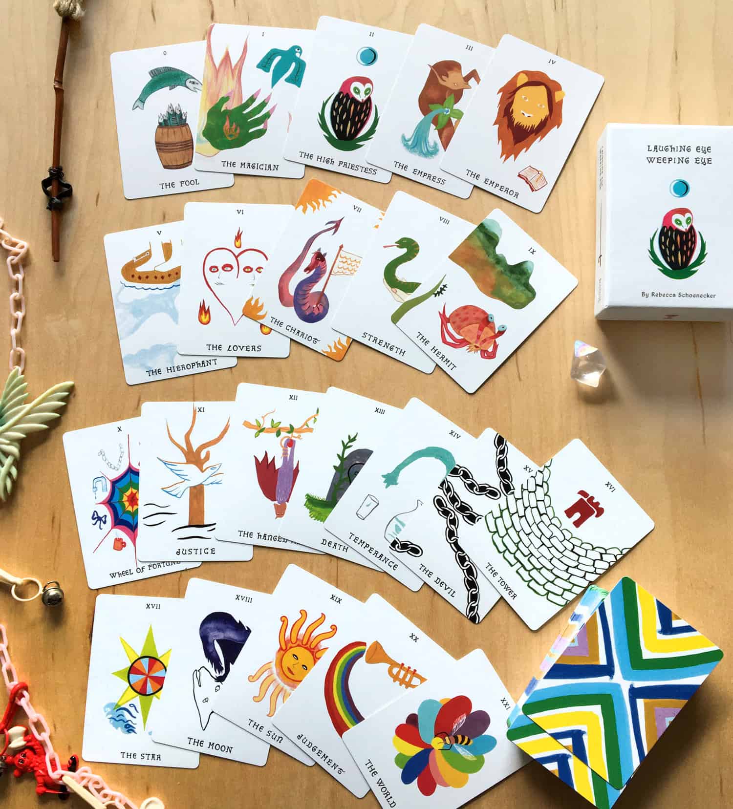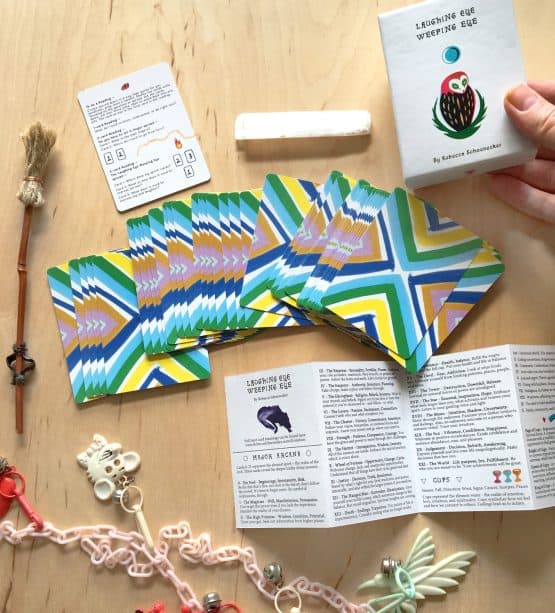 The Laughing Eye Weeping Eye tarot deck is a full, 78-card tarot deck created by Rebecca, which she often uses for her readings. While these cards rely on traditional meanings, the images are a modern blend of whimsical creatures and symbols; the deck has a folk art feel. Images in this deck were inspired by the Rider Waite Smith Tarot and the Tarot of Marseilles.