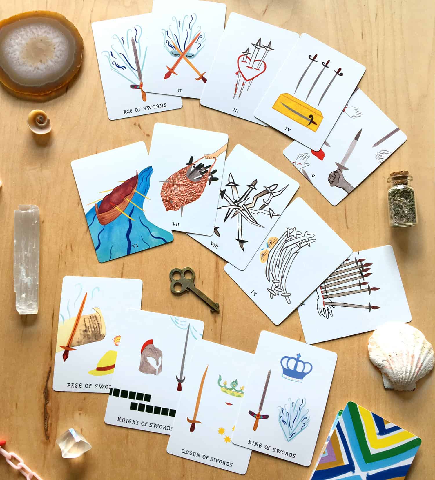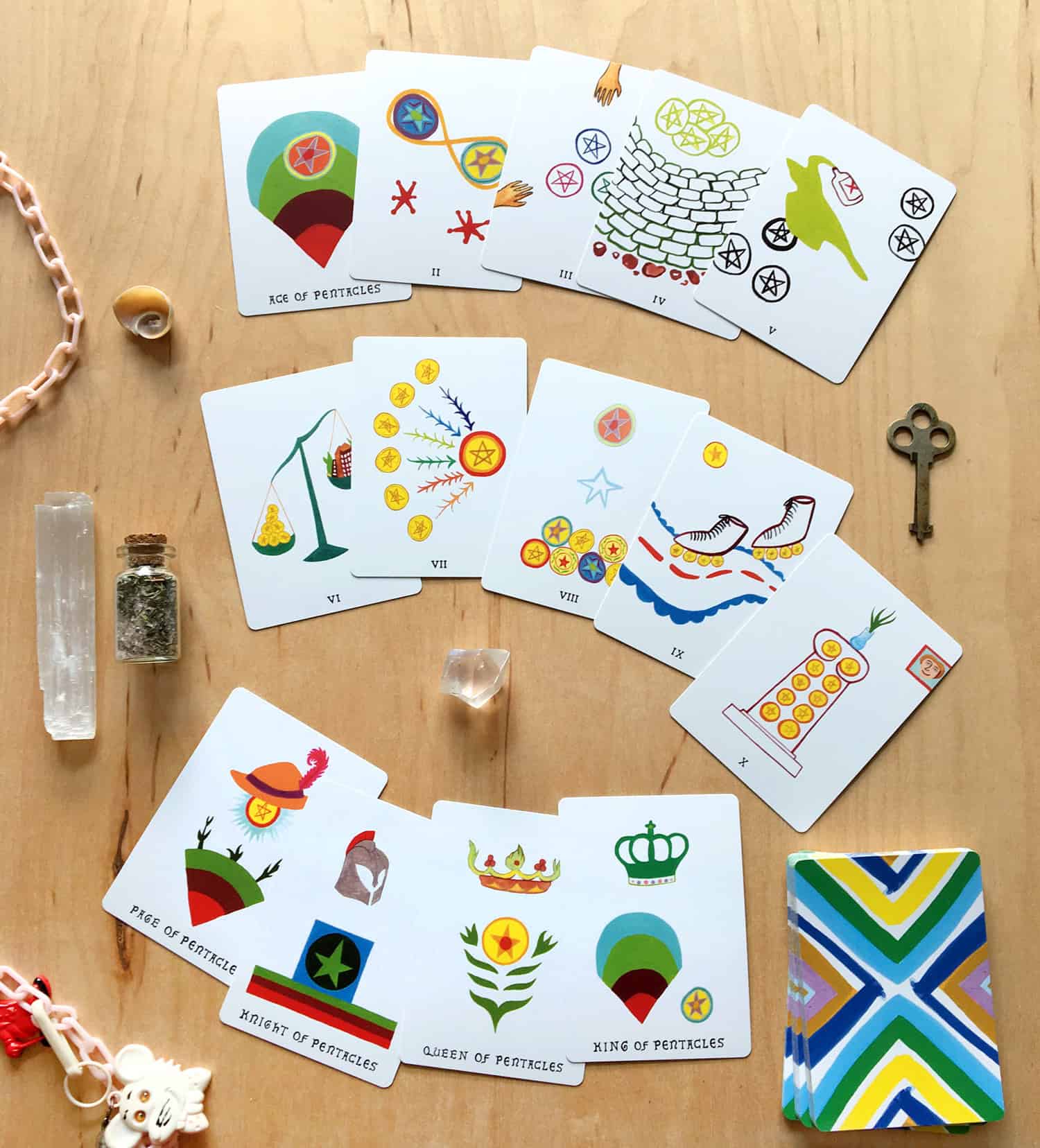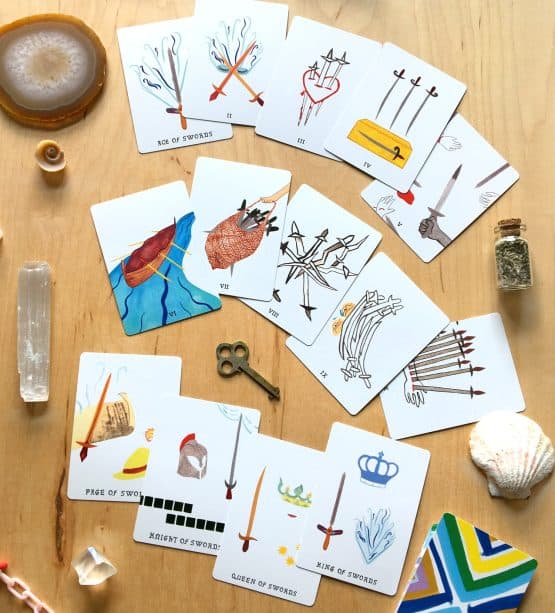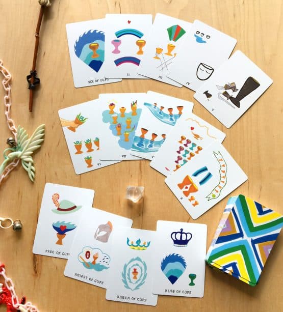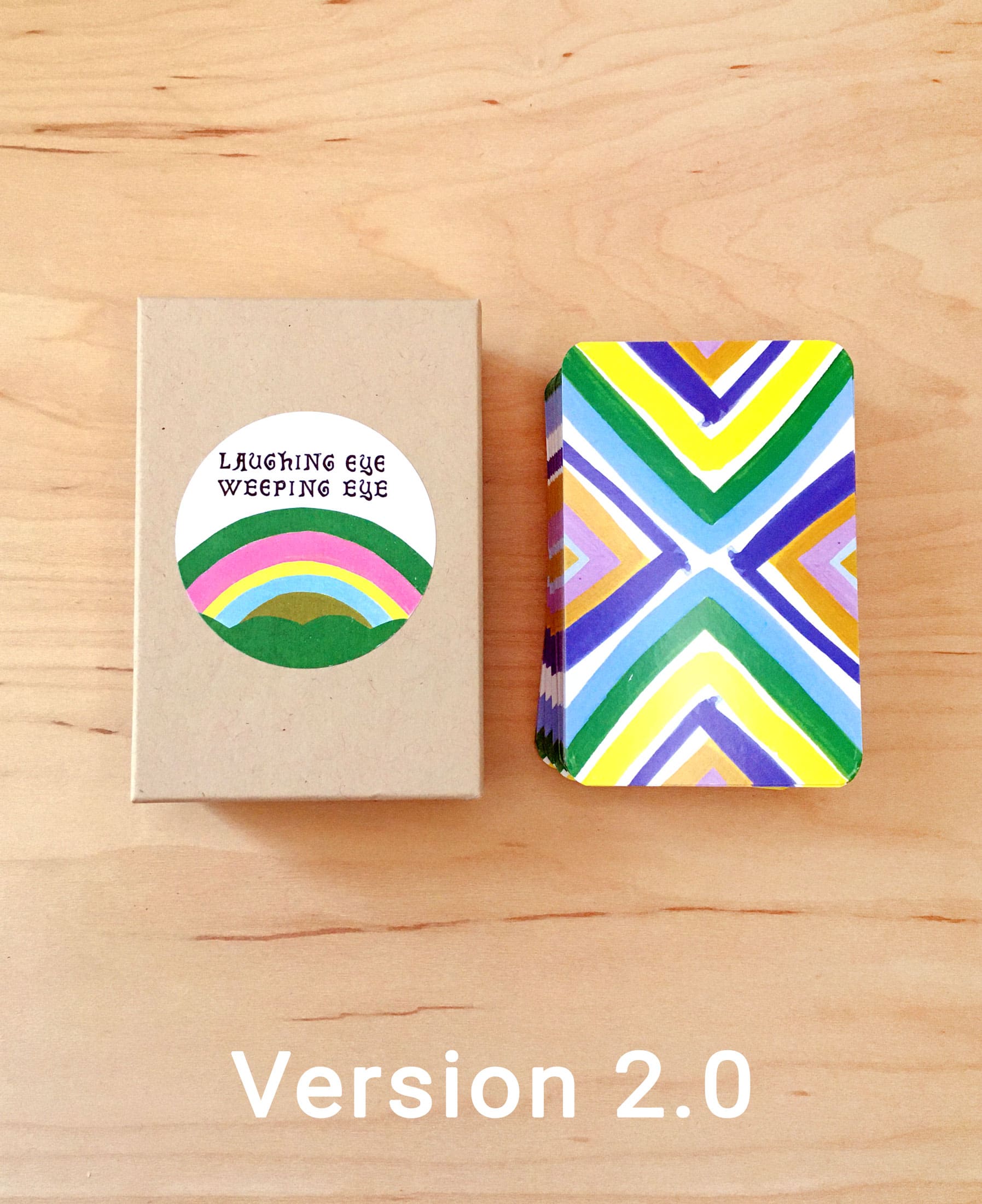 The Laughing Eye Weeping Eye tarot deck is a full, 78-card tarot deck created by Rebecca, which she often uses for her readings. While these cards rely on traditional meanings, the images are a modern blend of whimsical creatures and symbols; the deck has a folk art feel. Images in this deck were inspired by the Rider Waite Smith Tarot and the Tarot of Marseilles.