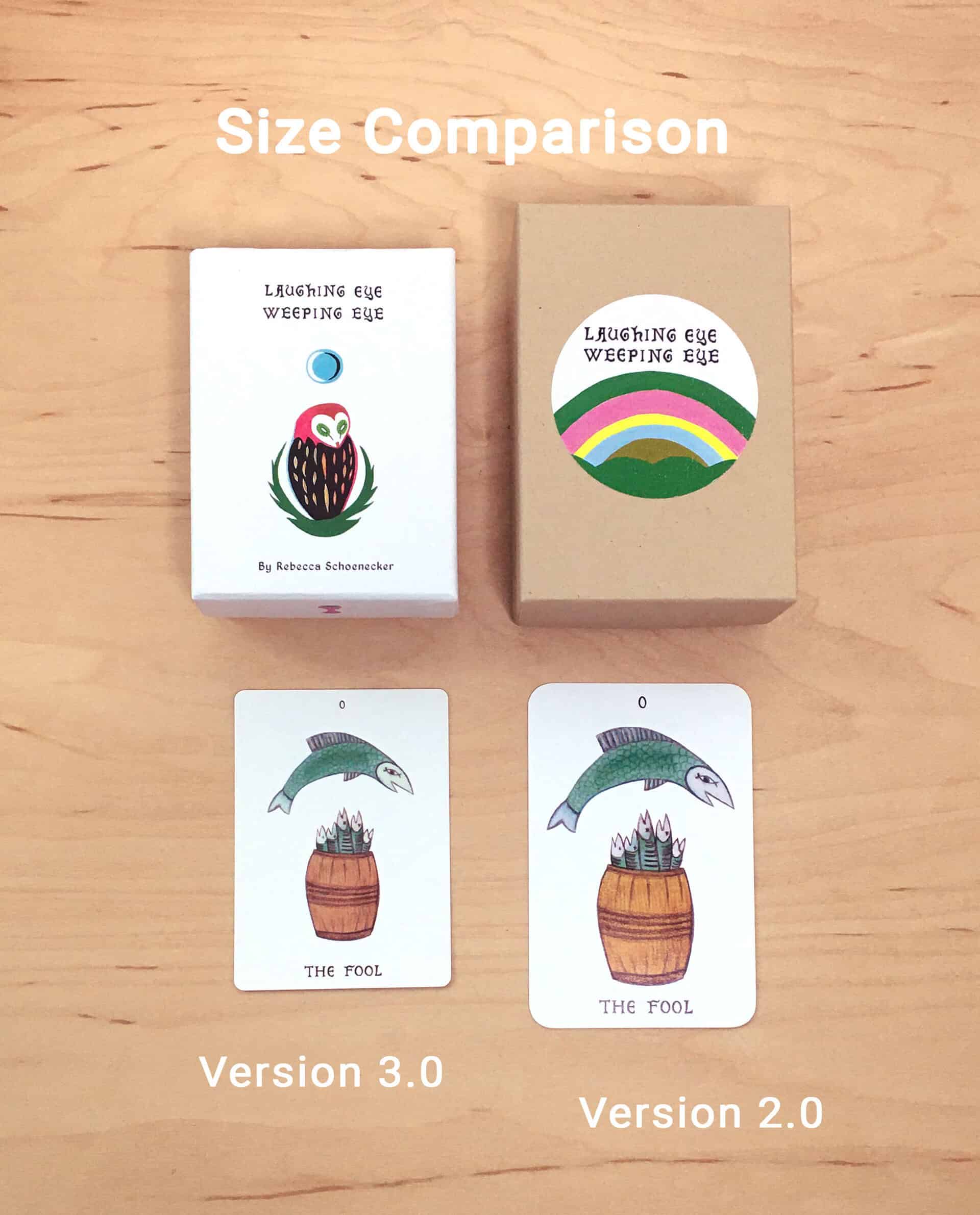 The size is also different. The newer version 3.0 (white box) cards are smaller, at 2.48″ x 3.46″. Version 2.0 (brown box) cards are sized: 2 5/8″ x 4.” The newest version is smaller. They are great for large spreads and also this is a handy deck to stow away in a purse or take on a trip.