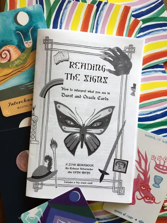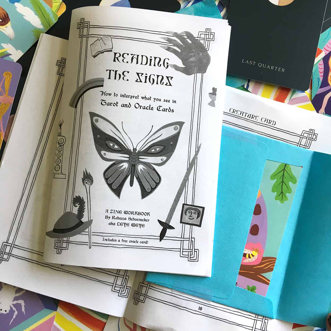 This zine workbook teaches you how to read signs and symbols in tarot (and oracle cards). Includes one oracle card from the Creatures of the Moon Oracle deck!