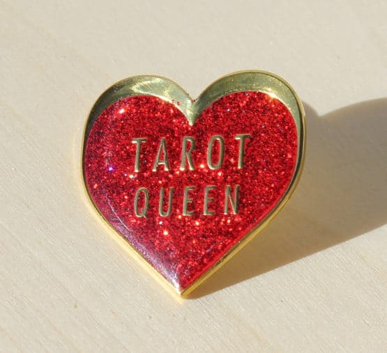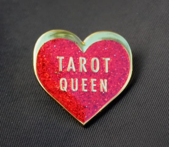 Hidee Ho, Tarot Queen of of the world! This fine sparkly enamel pin (1″ in size) shines for the great Tarot reader that is you. A great accessory for Tarot bags, backpacks, shoes and clothes. I like to sport my Tarot Queen Pin at the collar when I am reading at events. Let the good times sparkle.
