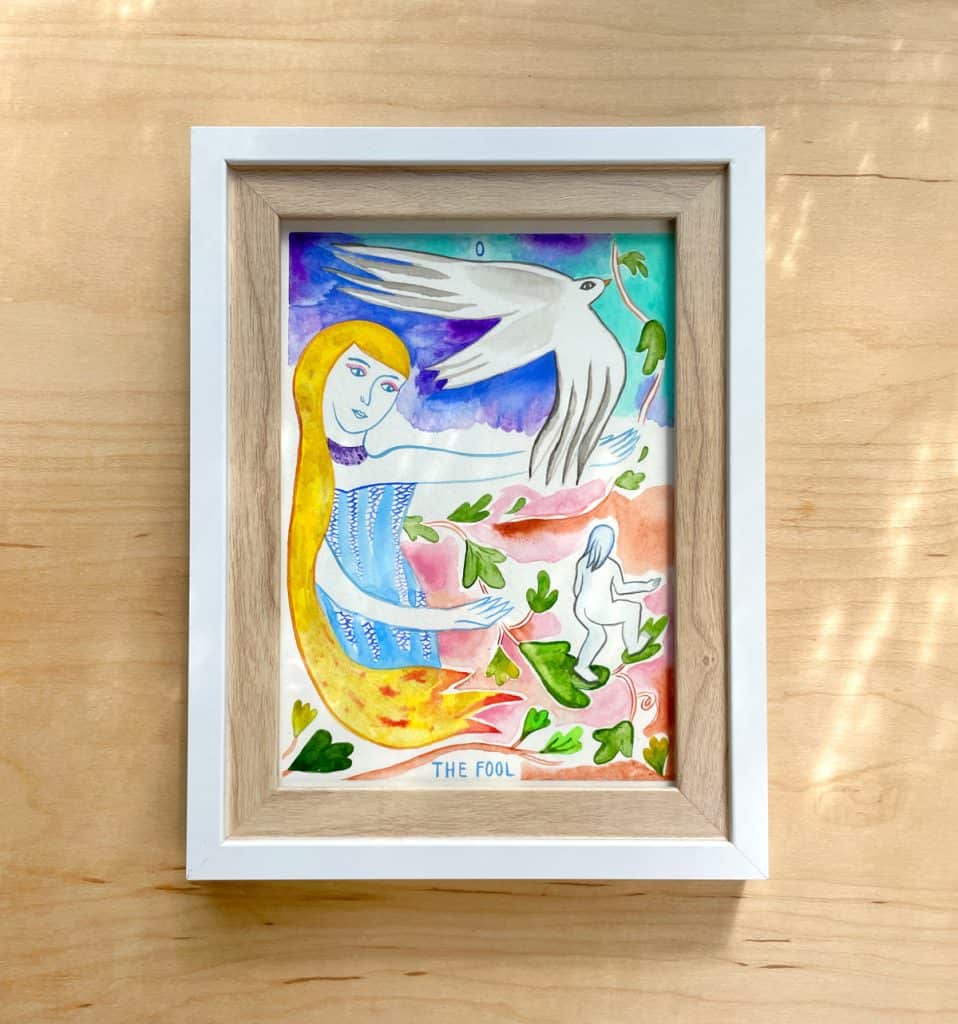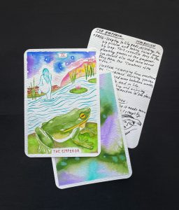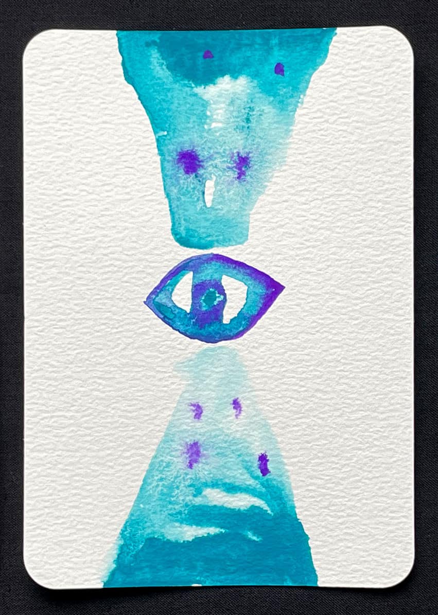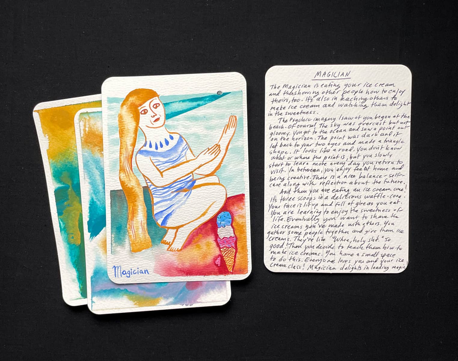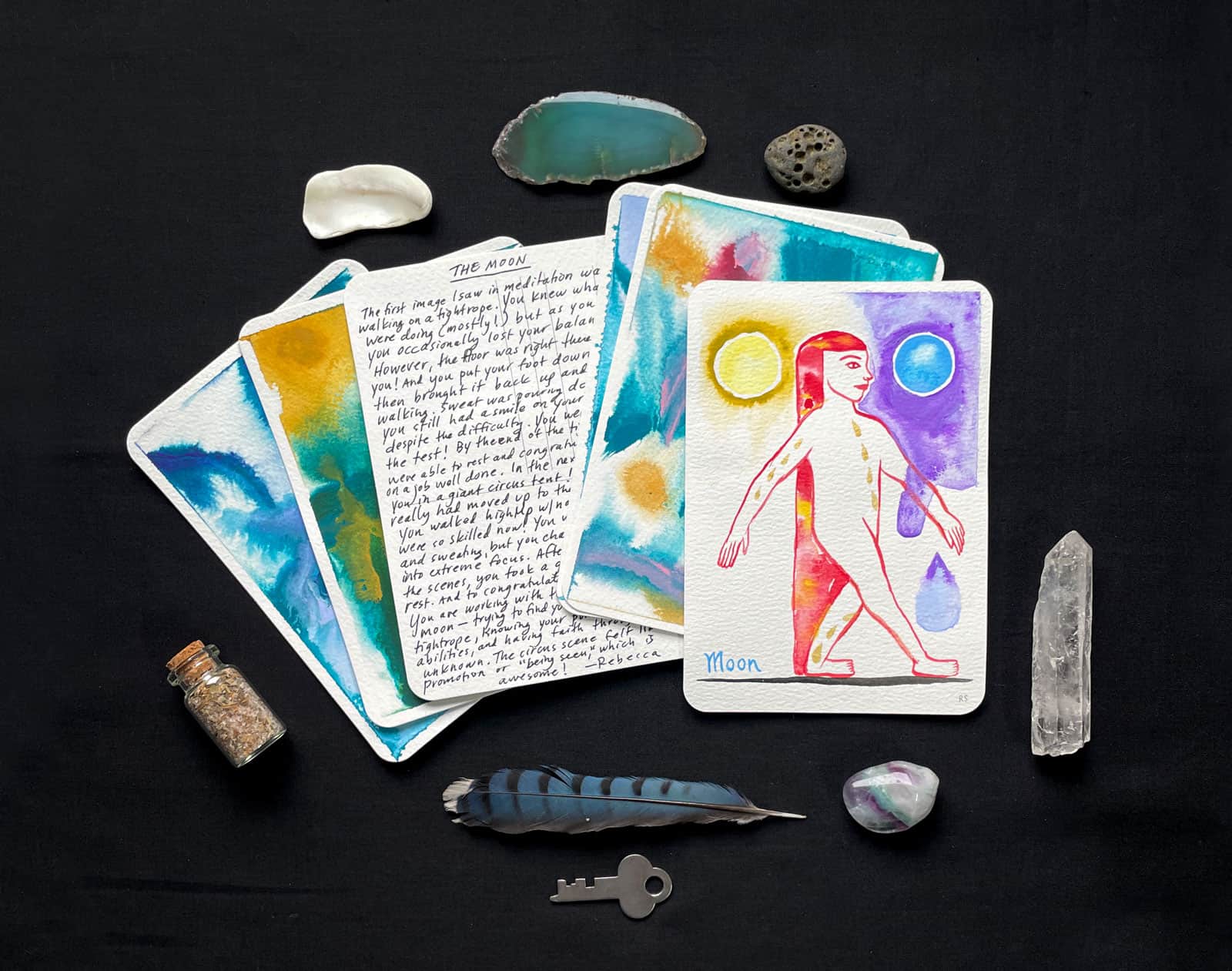 Following the recording, I create your psychic tarot card. The painting is done on cold-pressed watercolor paper and is 4 x 6 inches. The image I paint is a vignette from your story. I also include an extra painting with a handwritten note about your card.