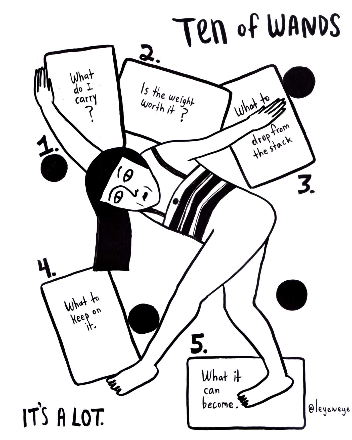 The Ten of Wands is the ability to climb to the top or the potential to be crushed by the strain of trying to get there. What helps is understanding your motivation and your picture of success and happiness.