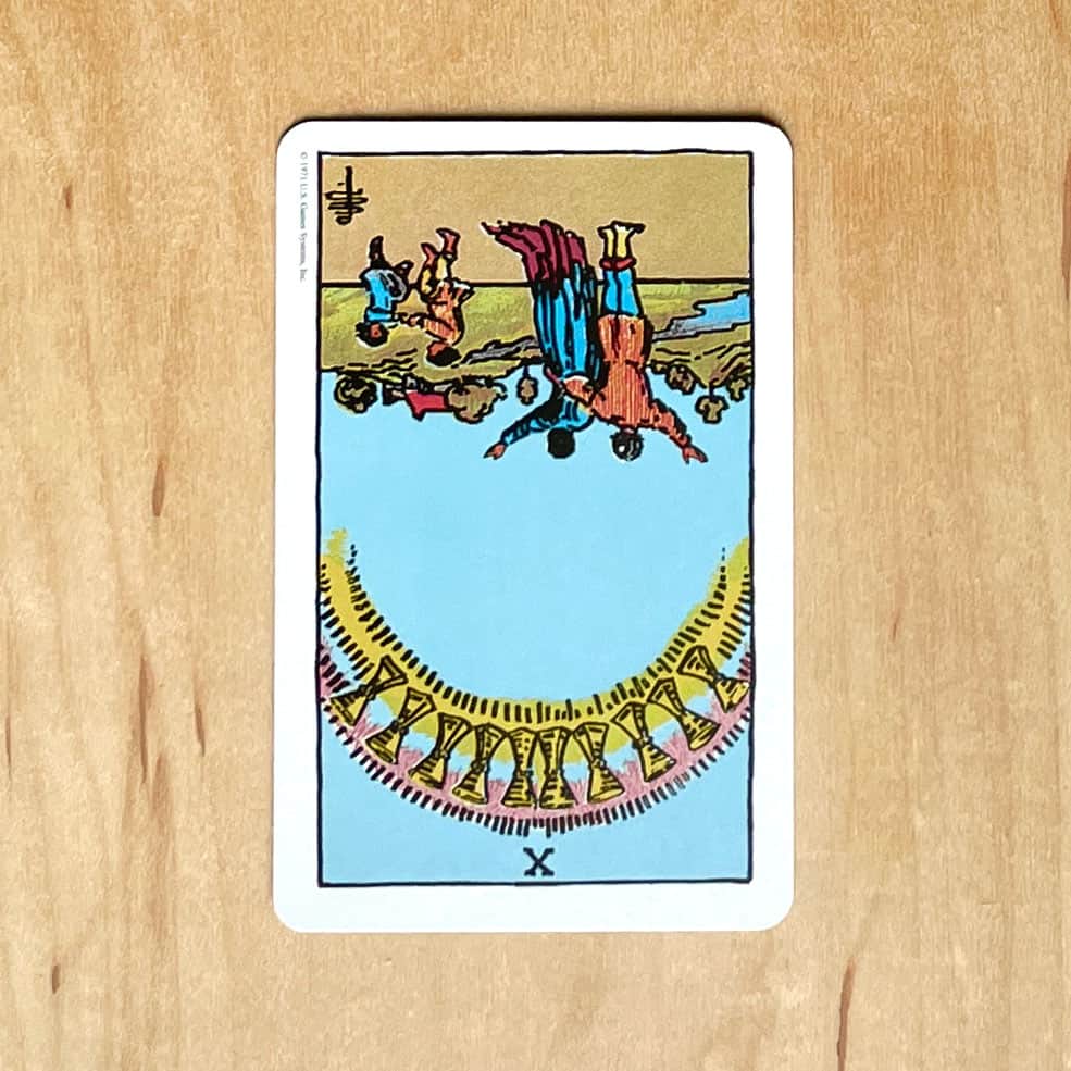 I shuffled while meditating on the question and how to best help the querent. The card I drew out of the deck was the Ten of Cups, but in the reversed position.