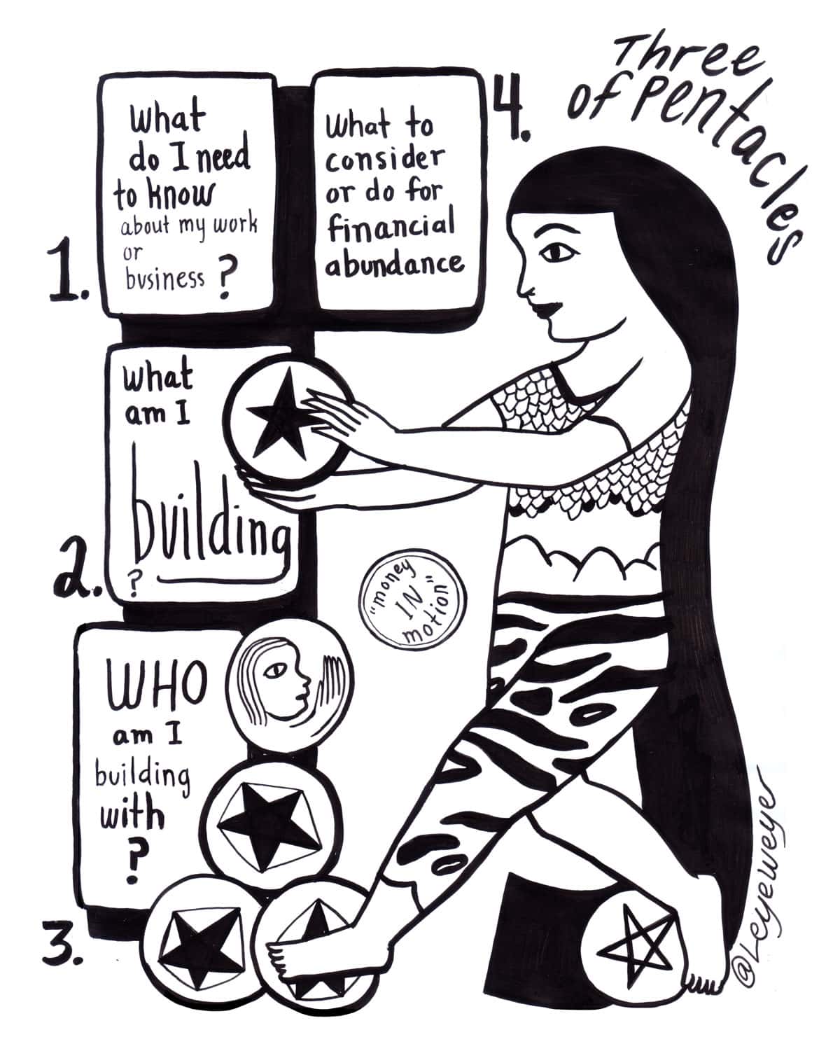 Most often, the Three of Pentacles is the spirit of earning through hard work, innovation, and alliance. Know what it is you’re after and unify abilities to make it real.
